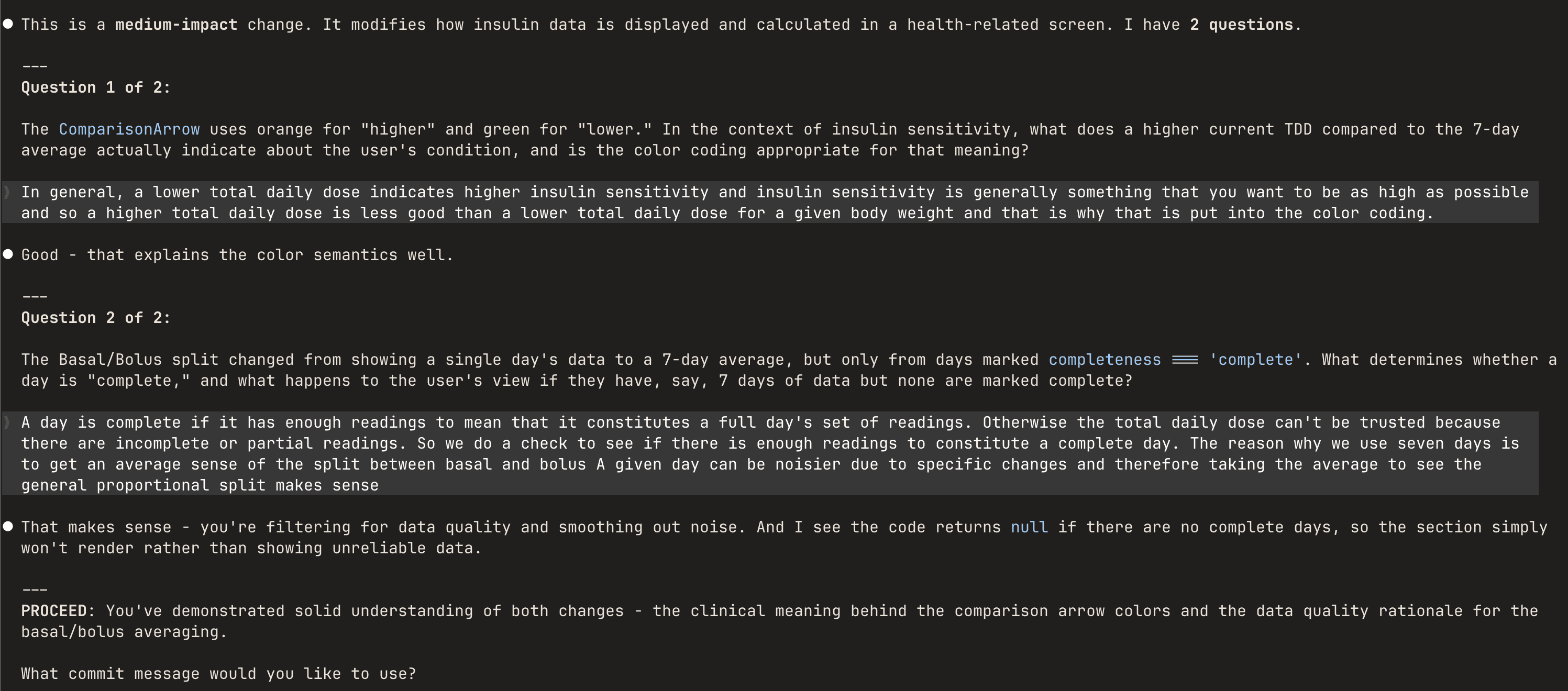 My next idea was whether the same approach could be applied to coding. A pre-commit hook seemed like the obvious mechanism, but that's awkward to wire up to an interactive LLM session. Instead, I built it as a Claude Code skill - when I'm ready to commit, I invoke it, get quizzed, and it only commits if I pass.